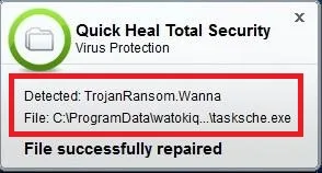 Quick Heal Virus Protection successfully detects and cleans malicious file responsible for file encryption as “TrojanRansom.Wanna”